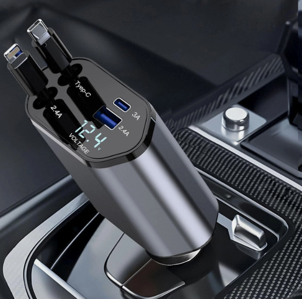 120W 4in1 autós töltő - Kihúzható kábellel TYPE-C + APPLE, PD USB Gyors töltés 12/24V