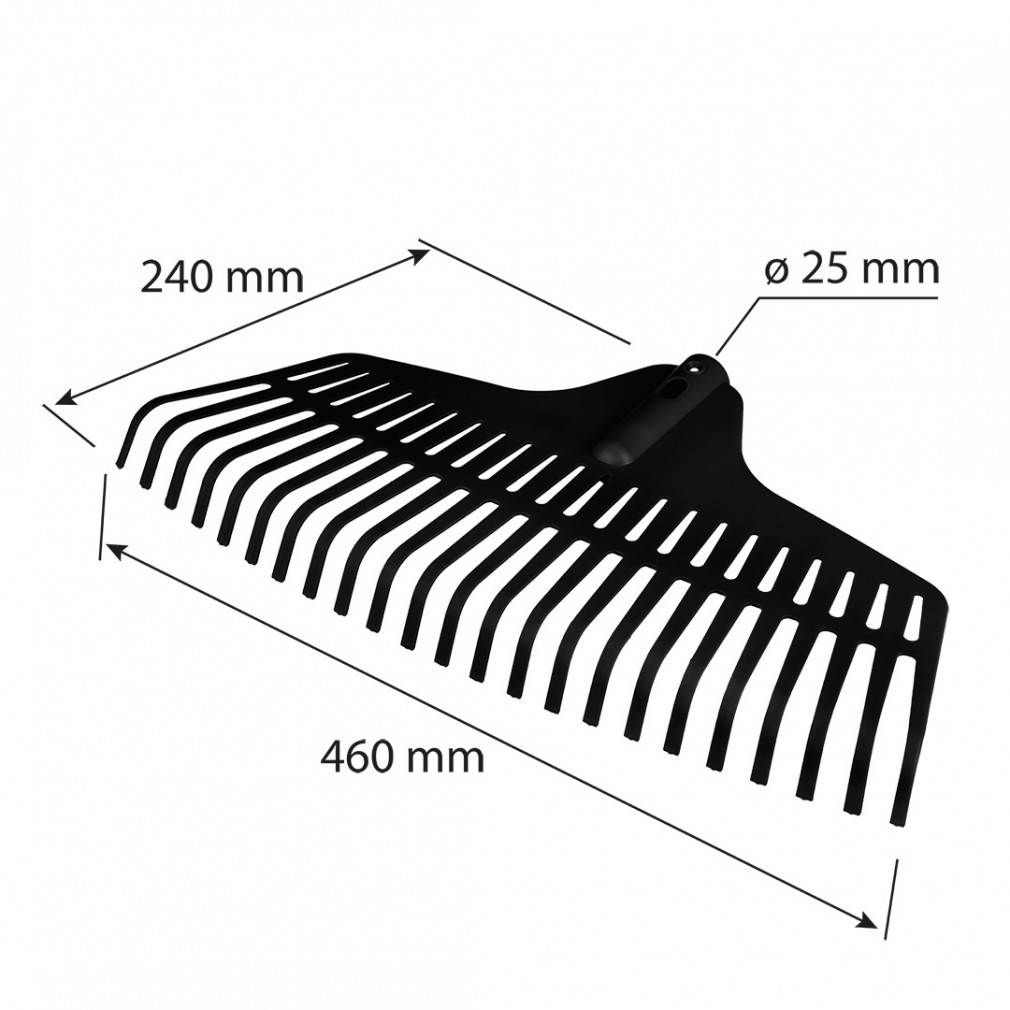 A VERTO közepes méretű lombgereblye, BLACK 15G086 460 mm szélességgel és 240 mm hosszúsággal rendelkezik. A nyél rögzítésére szolgáló furat átmérője 25 mm, magának a nyélnek az ajánlott átmérője pedig 23 mm. Fekete regranulátumból készülnek. Könnyűek és tartósak. A nyél könnyű cserélhetőségének köszönhetően a nyelet megoszthatják más kerti és mezőgazdasági szerszámokkal.