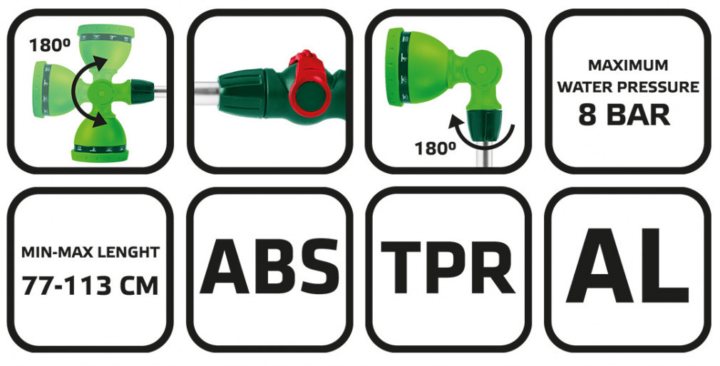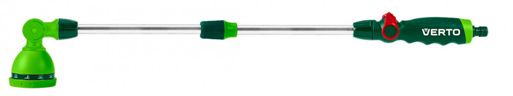 Sprinklerlándzsa, teleszkópos, 10-funkciós 28" - 48" 15G682 by VERTO, a hüvelykujjal fokozatmentesen állítható szóráskép. A lándzsa beállítási funkcióval lett ellátva, amely lehetővé teszi, hogy a sugár teljesítményét (akár 8 bar nyomást is kibír) az elvégzendő tevékenységhez igazítsa, a teleszkópos, alumínium szerkezet pedig lehetővé teszi, hogy magasban lévő tárgyakat vagy növényeket (pl. erkélyeket) is permetezzen. A lándzsa teljes hossza 79 - 115 cm vagy 28" - 48" hüvelyk között állítható. Az egyértelmű jelölések megkönnyítik a megfelelő permetszertípus kiválasztását. 10 különböző permetezőtípus közül választhat. A tartós ABS műanyagból készült, ergonomikus formájú nyél jól illeszkedik a kézbe, a kiegészítő TPR gumibevonat pedig biztosítja, hogy ne csússzon, növelve a kényelmet. A mindkét síkban 180 fokban mozgó fejnek köszönhetően bármilyen beállítás lehetséges a helyenkénti öntözéshez. A mozgatható fej és a teleszkópos kialakítás növeli a lándzsa sokoldalúságát, és számos felhasználási területre alkalmassá teszi.