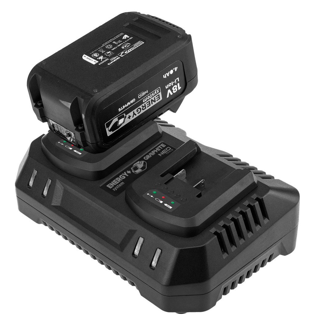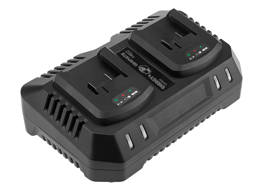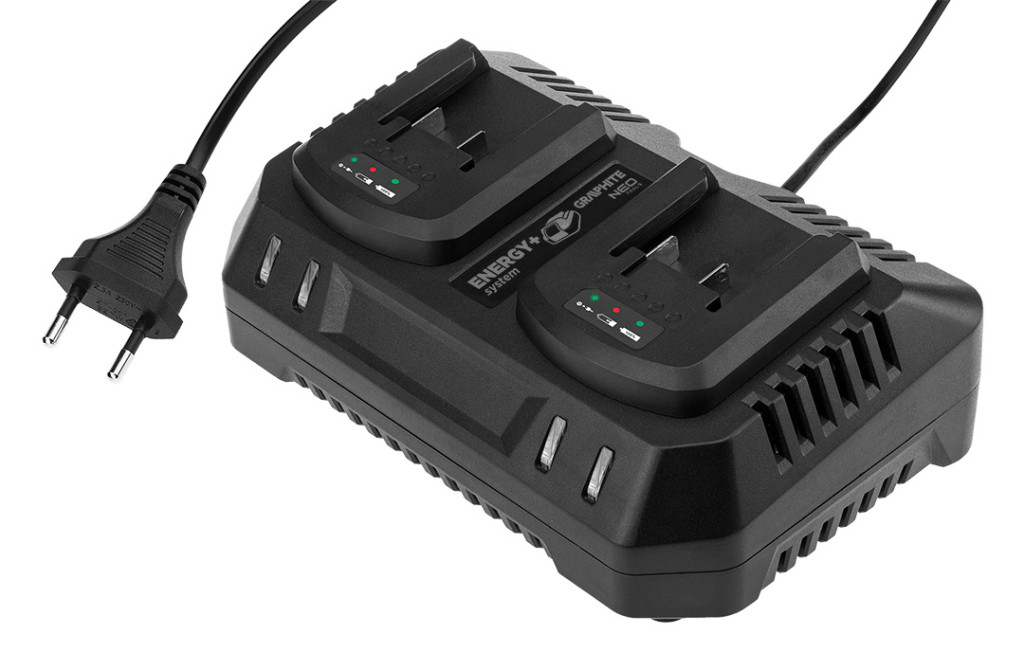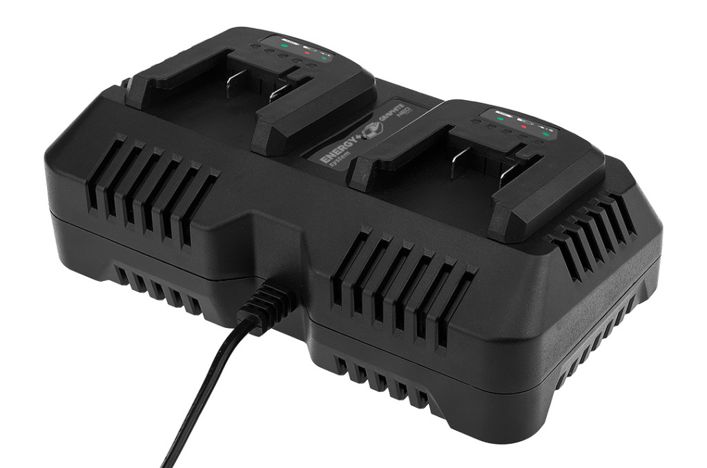 GRAPHITE 58G085-1 AKKUMULÁTORTÖLTŐ, ENERGY+ EGYAKKUS RENDSZERHEZ, DUPLA, 240W, 2X3A. Lehetővé teszi két akkumulátor egyidejű töltését. Maximális töltőáram 2 x 3A, a töltési idő az 58G001 akkumulátor esetében 45 perc, az 58G004 akkumulátor esetében 90 perc, az 58G086 akkumulátor esetében pedig 135 perc. LED-ek jelzik a csatlakoztatott akkumulátort, a folyamatban lévő töltést vagy a töltés végét. A GRAPHITE töltő feszültség- és hőmérséklet-szabályozó rendszerrel van felszerelve az akkumulátor és a felhasználó teljes védelme érdekében. A készülék rugalmas és robusztus tápkábellel rendelkezik.