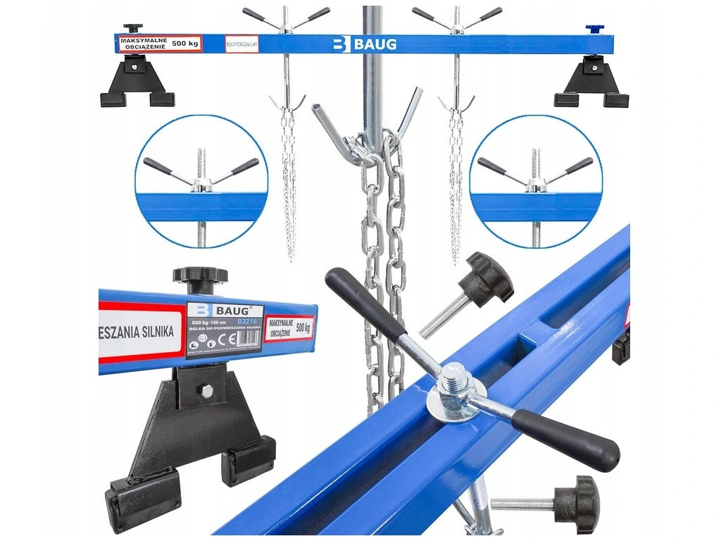 A BAUG B3216 motortartó-felfüggesztő gerenda egy professzionális szintű segédeszköz, amely a motor biztonságos megtartását és rögzítését szolgálja különböző szerelési munkák során. Elengedhetetlen például kuplung-, váltó- vagy motortartó-cseréknél, amikor a motor súlyát meg kell tartani, de a rögzítési pontokat szabadon kell hagyni a beavatkozáshoz. A 500kg teherbírás és a stabil acélkonstrukció garantálja a biztonságos munkavégzést, legyen szó akár házi garázsról, akár professzionális autószervizről.