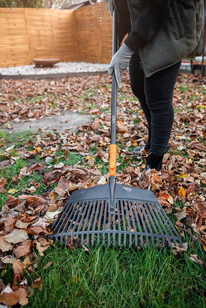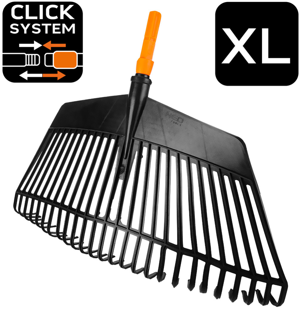 NEO 95-066 LOMBSEPRŰ, 370MM, MŰANYAG, NEO CLICK SYSTEM. Egy praktikus lombseprű, amely a NEO Click System-hez tartozik - egy olyan kerti szerszámsorozathoz, amely cserélhető nyéllel rendelkezik, így helytakarékos a tároláshoz, gazdaságos és többcélú. A 3,5 mm vastag fogakkal ellátott lombseprű talajelőkészítéshez, gyepápoláshoz vagy gyomtalanításhoz ajánlott. A 210 mm-es hossz és a 370 mm-es munkarész szélesség megkönnyíti a feladatokat. A műanyag szerkezet és a PP rögzítés hozzájárul a minőséghez. A NEO TOOLS műanyag lombseprű olyan termék, amely minden kertben hasznosnak bizonyul.