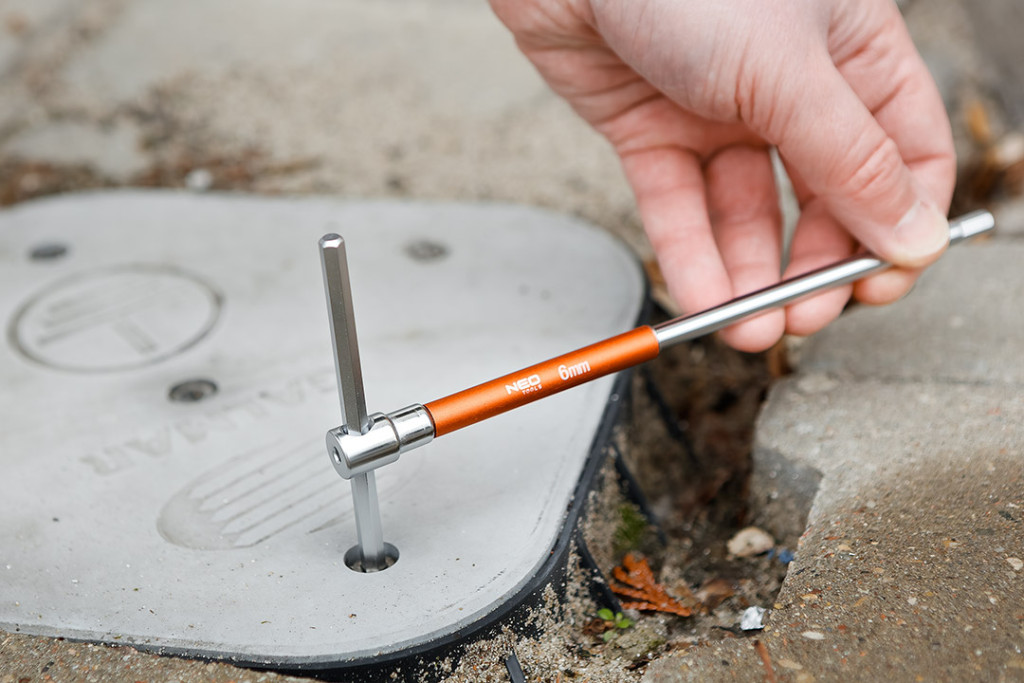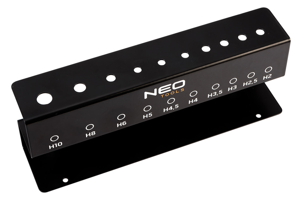 NEO 09-509 Imbuszkulcs készlet, T-fogantyús, 2-10mm, 10db-os.HEX kulcsok. 10 különböző méretű imbuszkulcsból és egy praktikus, 220 x 40 x 82 mm méretű felakasztható állványból áll. A kulcsok tartós CRV fémötvözetből készültek. Méretek: H2 (125 x 65 mm), H2,5 (125 x 65 mm), H3 (125 x 65 mm), H3,5 (125 x 65 mm), H4 (177 x 90 mm), H4,5 (177 x 90 mm), H5 (181 x 89 mm), H6 (209 x 106 mm), H8,(250 x 122 mm), H10 (300 x 145 mm). Hosszuknak és változatosságuknak köszönhetően lehetővé teszik a mélyebben fekvő csavarokhoz való hozzáférést is. A NEO TOOLS készlet kétféle felhasználási lehetőséget is kínál: a hosszabbik rész gömbfejű a rövid sima hatszög típusú fejjel rendelkezik. A kulcsok mindenütt hasznosnak bizonyulnak, ahol imbusz csavarokat használnak, pl. kerékpárjavító műhelyekben vagy egyéb járműszerelési munkák során. A mellékelt állvány segítségével rendben és könnyen elérhető helyen tarthatók.