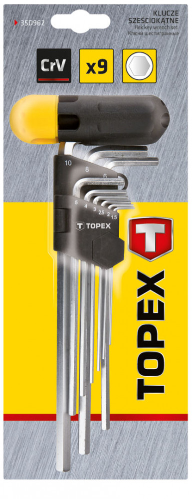 A TOPEX imbuszkulcsok nagy ellenállóképességű, a terméknek hosszú élettartamot biztosító króm-vanádium acélból készülnek. Kiegészítő elem a kulcs kényelmesebb megfogását biztosító markolat. A praktikus, mindegyik kulcsnak külön megjelölt rekesszel rendelkező műanyag csomagolás megkönnyíti a tárolásukat. A TOPEX márka ezermestereknek készül.