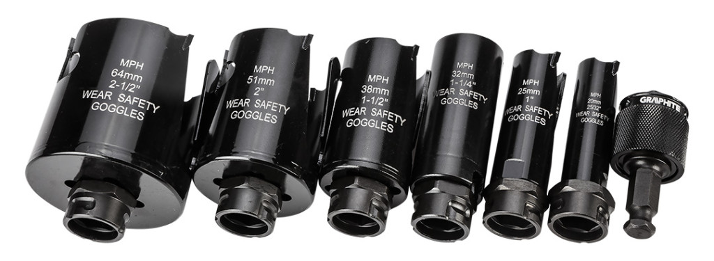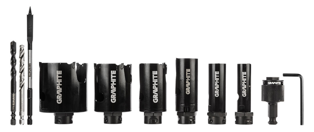 GRAPHITE 57H923 Körkivágó készlet, bi-metál, HSS Co 8%, 19,25,32,38,51,64mm. A szerszámok maximális fúrási mélysége 50 mm. Magasságuk 65 mm. INOX, fém, műanyag, alumínium és réz anyagok megmunkálásához ajánlott. A készlet tartalmaz továbbá egy univerzális fúrószárat ¼" kerek szárral (6,35 mm) és egy 7/16" hatlapú szárral (11 mm), két HSS központfúrót (6,35 x 105 mm átmérőjű, 6,35 x 75 mm átmérőjű) és tartozékokat - 2 irányú adapter, alátét, imbuszkulcs. A GRAPHITE márkától ez egy többfeladatú készlet profiknak és barkácsolóknak.