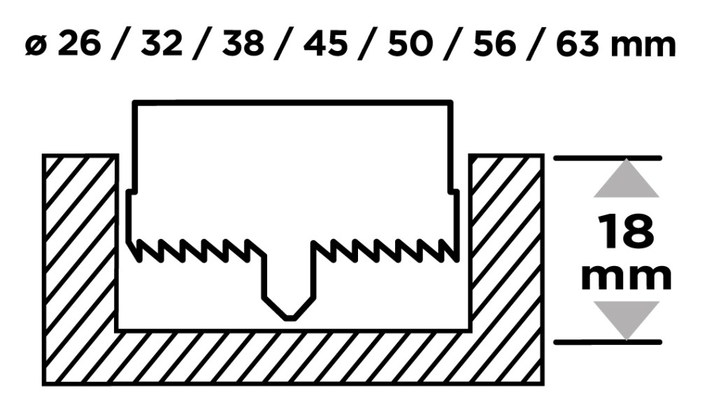 Körkivágó készlet fához, műanyagokhoz, acél, edzett fogakkal, 26-63mm, 18mm fúrásmélység