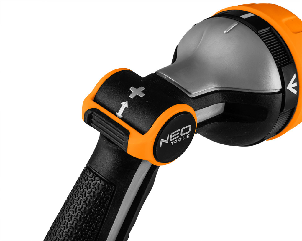 NEO 15-708 Öntözőpisztoly, 5 funkciós, hüvelykujj szabályozás. 5 öntözőfunkcióval van felszerelve, amelyek lehetővé teszik az öntözés típusainak az igényekhez való igazítását: erős pontsugár, köd, szellőztetett pontsugár, zuhany, szórt permet. A szórópisztoly ON/OFF hüvelykujjzárral rendelkezik, ezért folyamatosan működtethető. Az ergonomikusan kialakított fogantyú jól fekszik a kézben és nem csúszik, ami kényelmesebbé teszi a munkát. Az esőztető fémtárcsával van felszerelve.