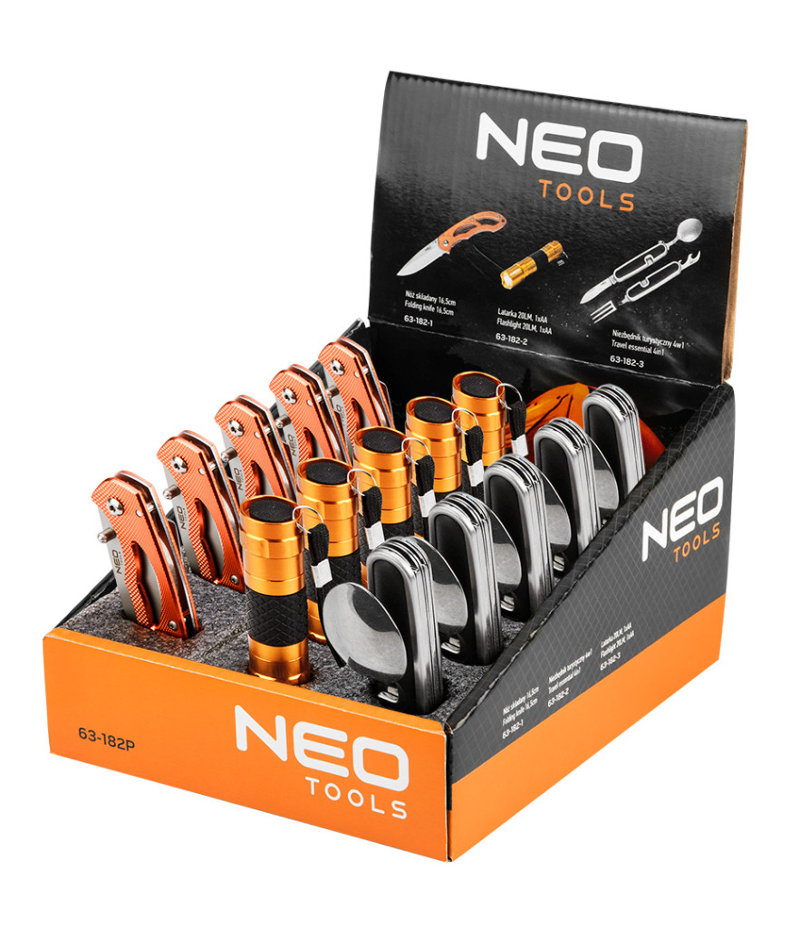 NEO 63-182P PAPÍRDISPLAY, KÉS, ZSEBLÁMPA STB TERMÉKEKHEZ. Túrázáshoz szükséges termékek kihelyezésére szolgáló papír display, pl. a következő termékekhez: 16,5 cm-es összecsukható kés 63-182-1 , 20 LM mini zseblámpa, 1xAA 63-182-2 NEO TOOLS, 4 az 1-ben kemping evőeszköz készlet, 63-182-3 . A doboz méretei: mélysége 20 cm, szélessége 16 cm, magassága 20,5 cm. Kartonból készült, jól használható figyelemfelkeltő displayként üzletekben és promóciós standokon.