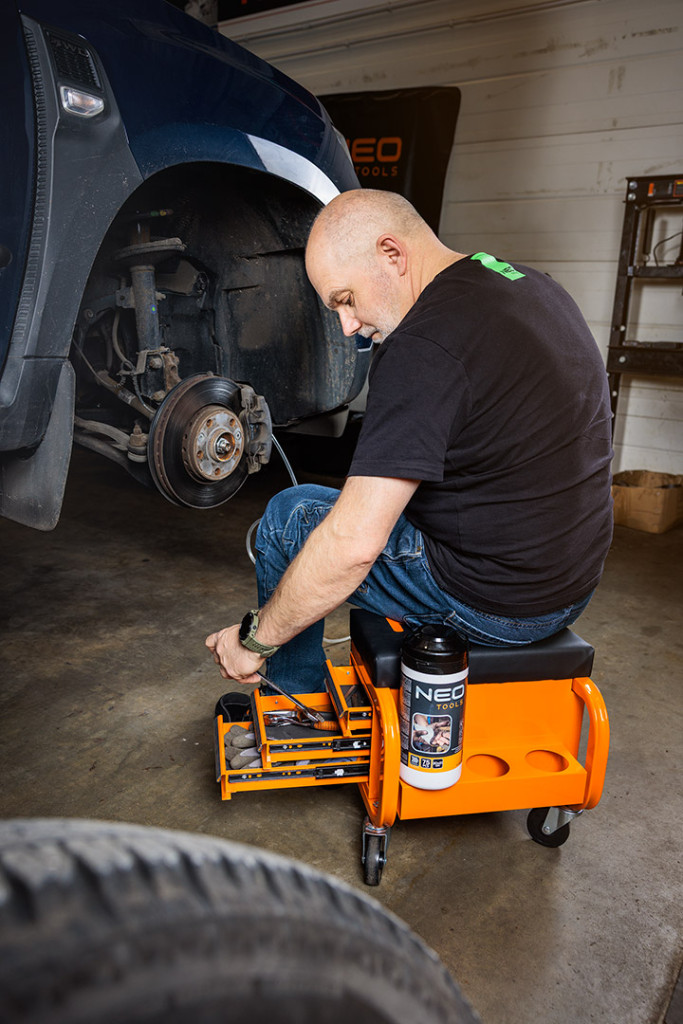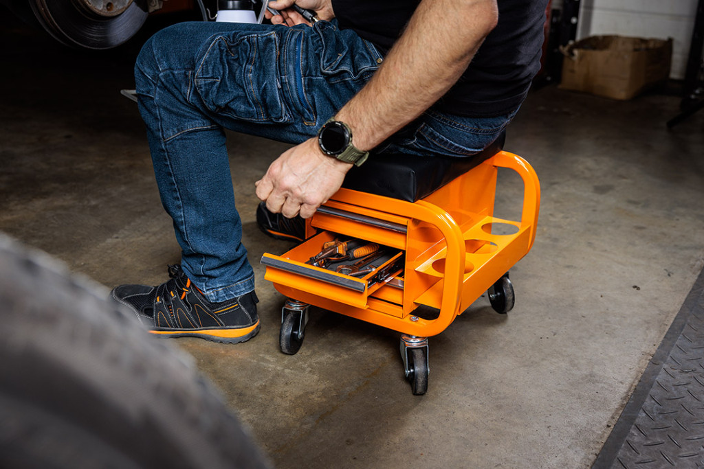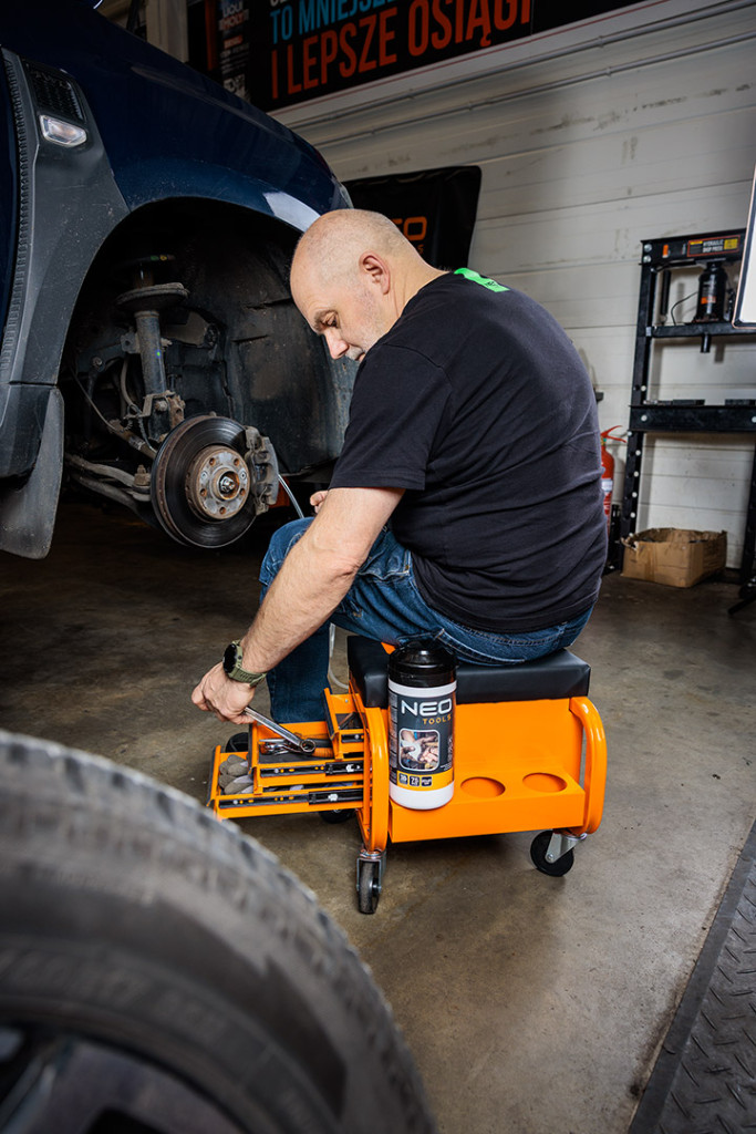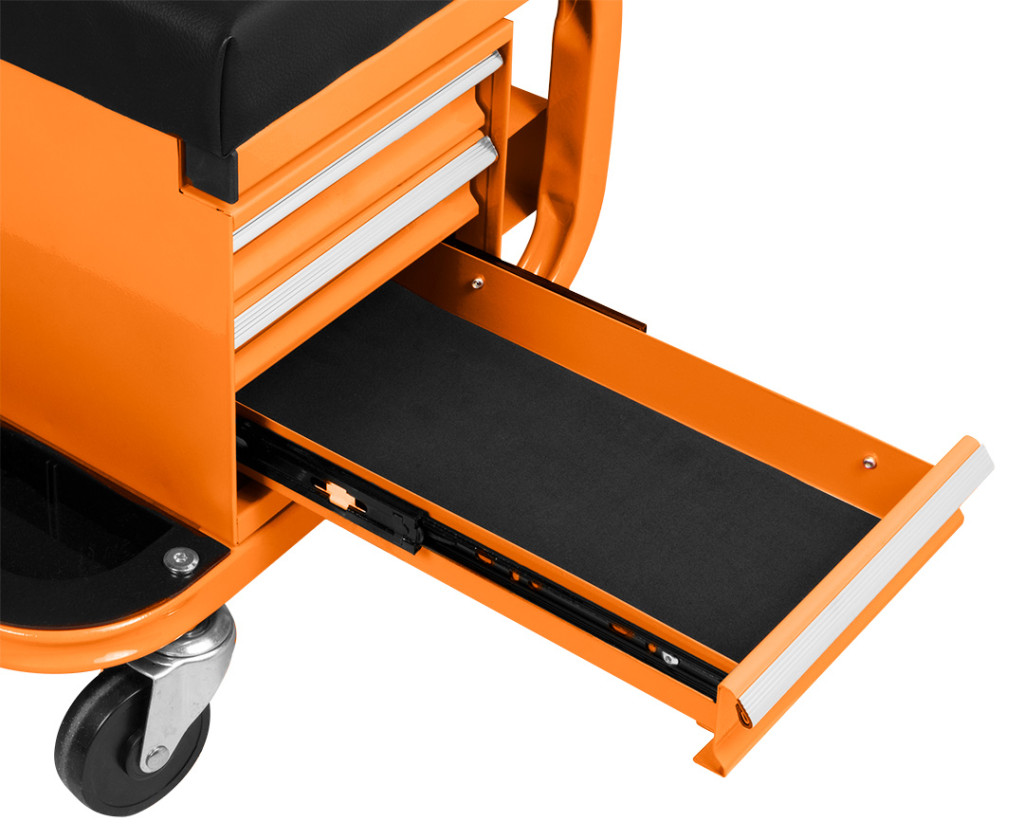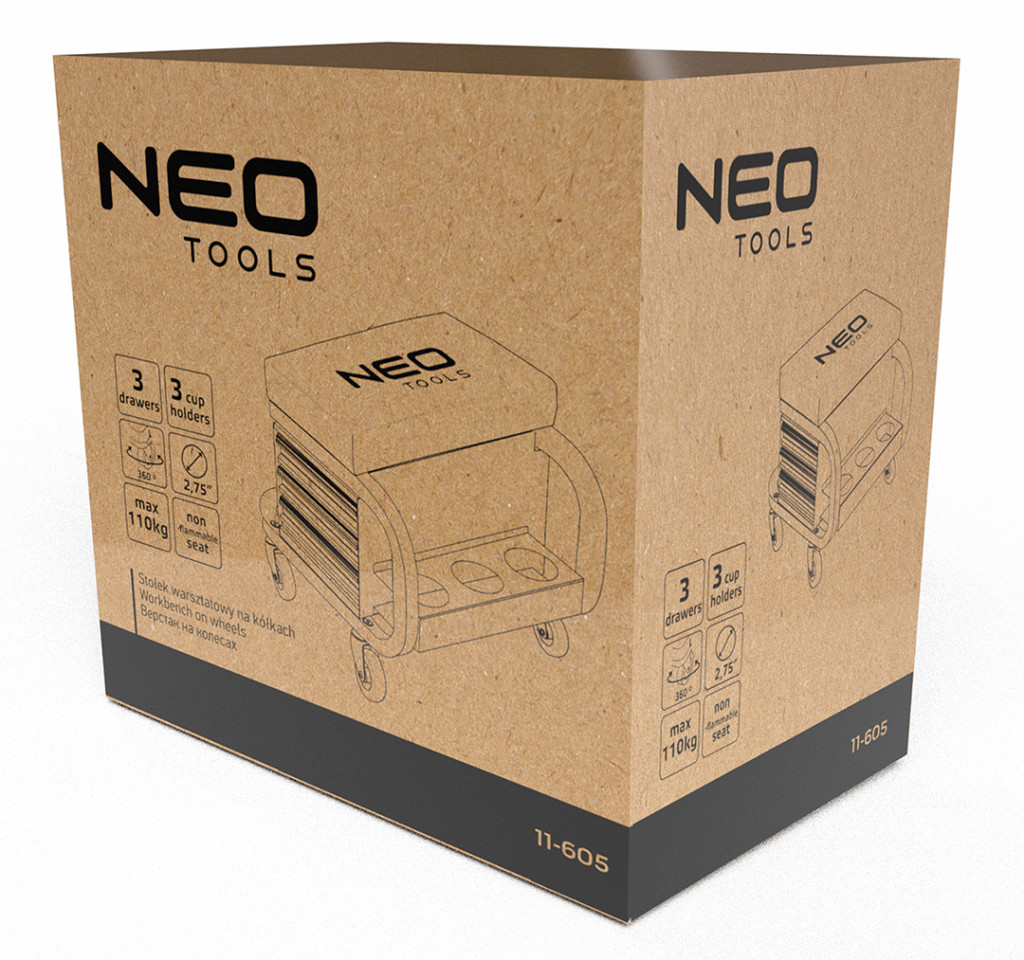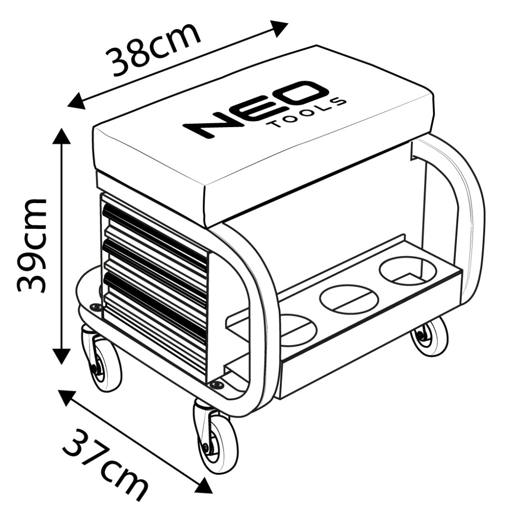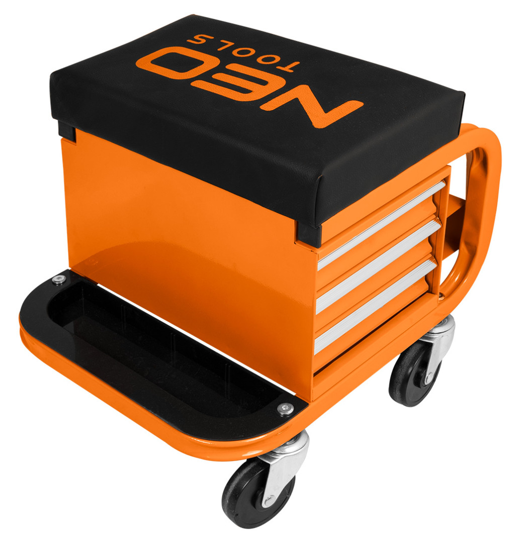 NEO 11-605 Szerelőszék, fém szerkezetű, kerekekkel, szerszámfiókokkal. A robusztus zsámoly porszórt acélszerkezettel és lángálló anyaggal bevont üléssel - megfelelő tartósságot és biztonságot biztosít. Maximális terhelhetősége 110 kg. Teljes mérete 38 x 39 x 37 cm, fiókjának mérete pedig 30 x 15 x 4 cm. Négy 360 fokban manőverezhető görgővel és három tartóval a dobozok, palackok vagy spray-k számára, kényelmet és komfortot biztosít. A porszórt bevonatnak köszönhetően hosszú évekre garantálja a színtartósságot. Sok órán át tartó műhelymunkák során is jól fog működni.