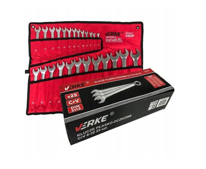 A Verke V35330 villáskulcs készlet egy 25 darabos, professzionális minőségű csillag-villáskulcs szett, amelyet otthoni és műhelyhasználatra egyaránt terveztek. A készlet minden darabja króm-vanádium acélból (CrV) készült, amely nagy szilárdságot és hosszú élettartamot biztosít még intenzív igénybevétel mellett is. A kulcsok DIN 3113 szabvány szerint gyártottak, így pontosságuk, illeszkedésük és megbízhatóságuk garantált.