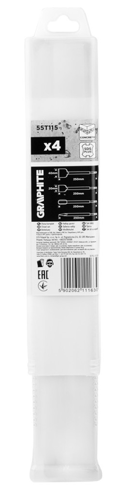 GRAPHITE 55T115 Vésőkészlet, SDS PLUS, 4db-os. Hegyes, lapos és kanalas kialakítású vésőkkel, 250 mm-es teljes hosszal rendelkeznek. Kovácsolt acél véső amely minden profi szakember és barkácsoló felszerelésében felbecsülhetetlen értékű eszköz.