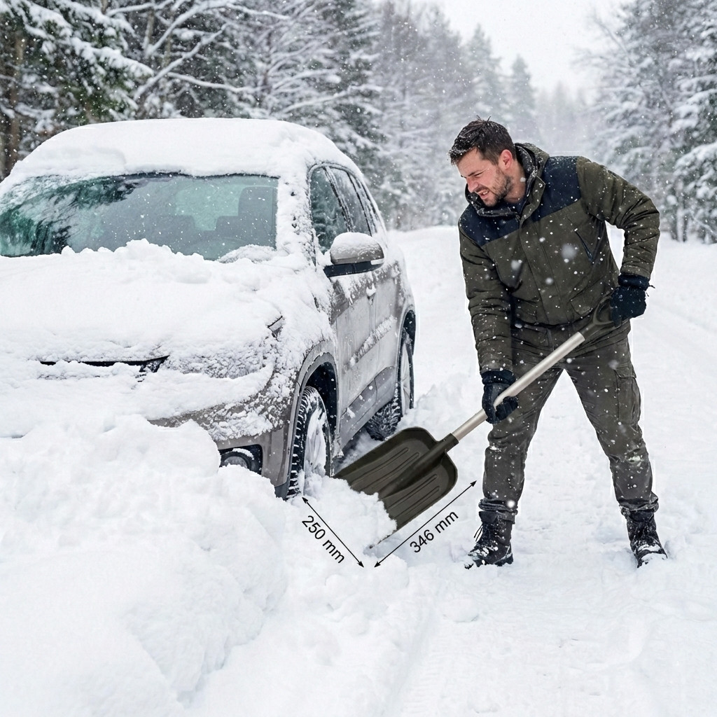 A műanyag lapátfej méretezése lehetővé teszi a hatékony hótolást anélkül, hogy feleslegesen nagy ellenállást fejtene ki. A 250 mm-es szélesség és a 346 mm-es magasság jól kiegyensúlyozott arányt biztosít: elegendő mennyiségű hó mozgatható meg vele, miközben szűk helyeken – például kerék körül vagy parkolóban – is pontosan használható. A műanyag anyag kíméli az autó fényezését, így csökkenti a karcolás kockázatát.